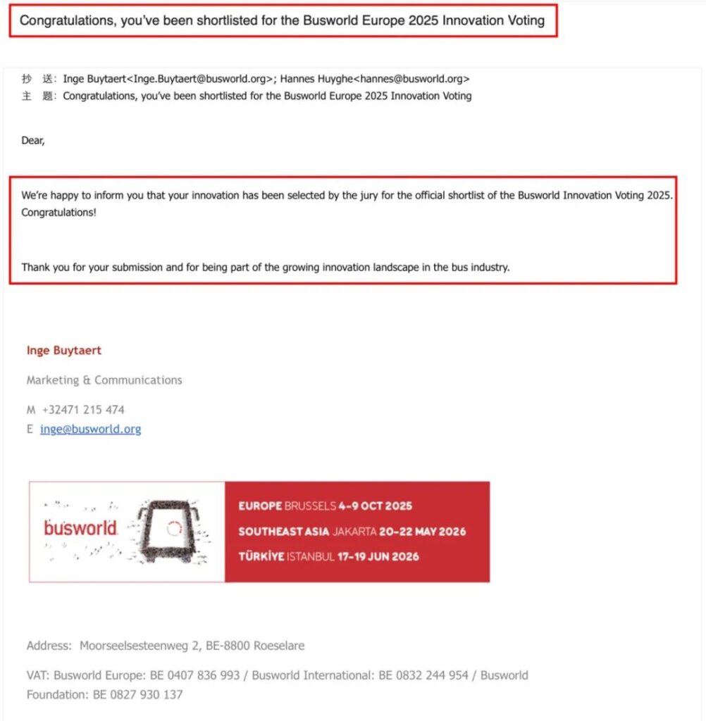 Busworld Europe stands as one of the world’s largest and longest-running professional bus exhibitions, renowned for its authority and foresight. Its Innovation Award specifically honors the most groundbreaking and influential technologies and products within the global bus and components industry, serving as a “barometer” for technological advancement in the sector. Senptec’s nomination signifies global recognition of its product’s innovation and advancement by authoritative experts.