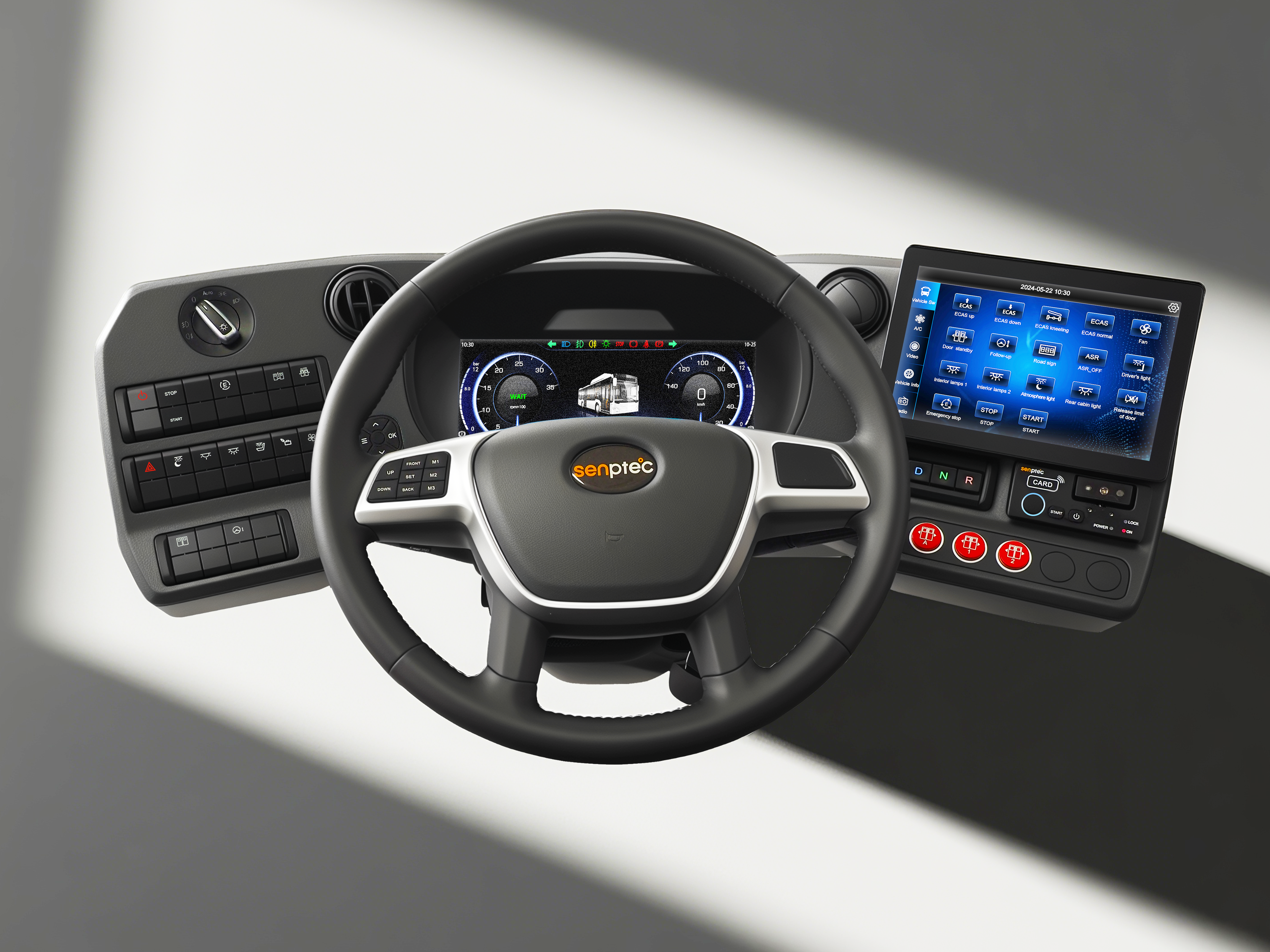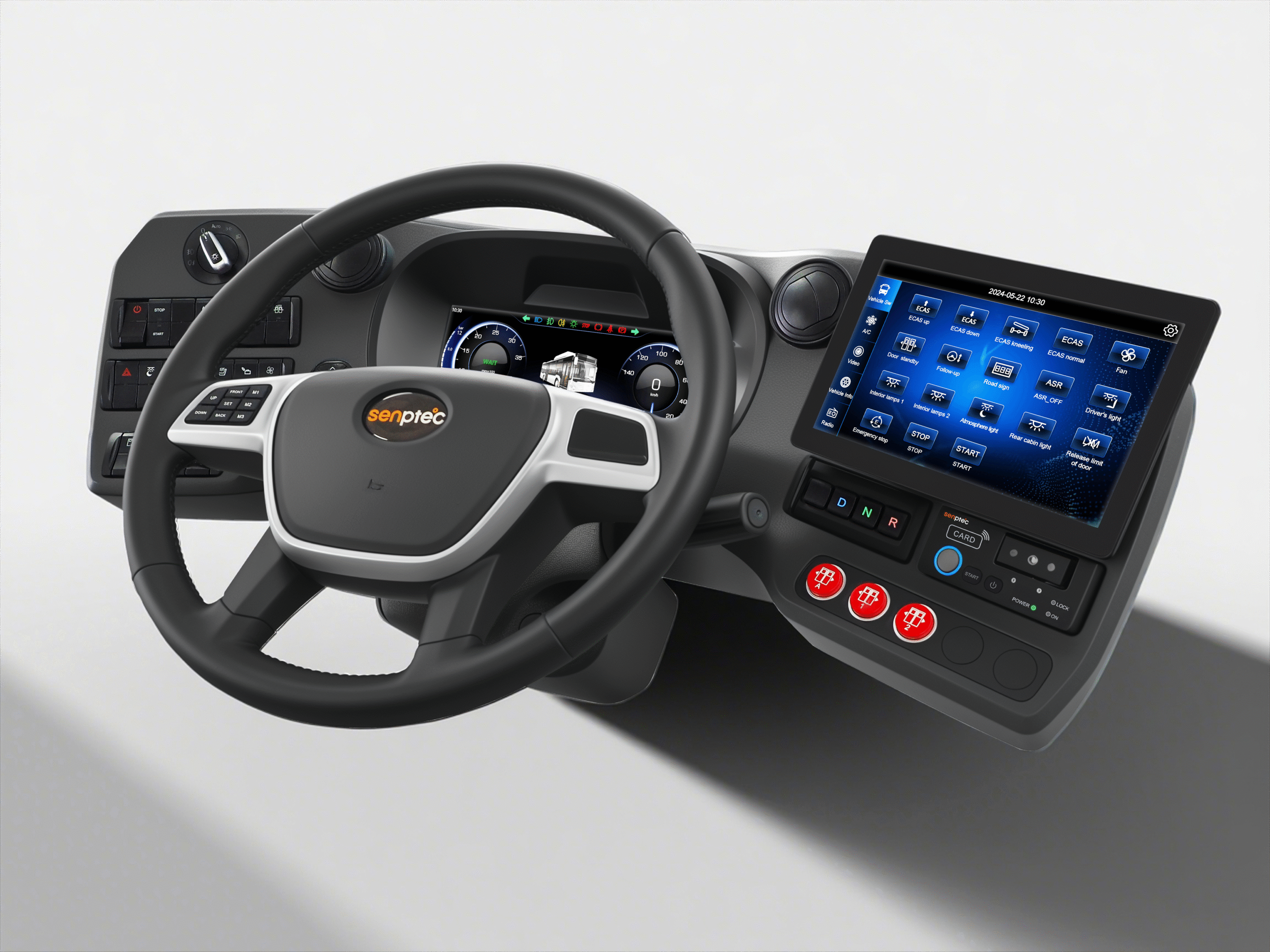 Senptec’s electrically adjustable Driver’s Work Place marks the first systematic integration of passenger car-level comfort and intelligent features into commercial vehicles. It elevates adjustment operations “from manual to electric” while deeply integrating multiple smart functions: digital key ignition, electric dashboard adjustment with position memory, heated steering wheel with hands-off detection, intelligent central control interaction, and full-digital instrument display. Together, these elements create a highly integrated, responsive smart driving environment. Moreover, this product has fully passed relevant EU certification standards and is ready for mass production. It delivers comprehensive upgrades in intelligence, convenience, and safety, offering drivers an unprecedented, revitalized experience.